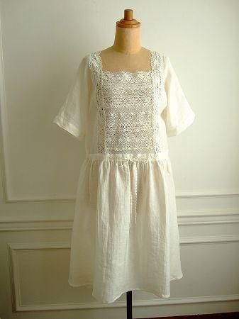 color オフホワイト、素材 Linen100%、(トーションレース レーヨン70%、リネン30%)、made in Japan、size F、着丈101m、バスト100cm、袖丈28cm、肩幅38cm、※裏地は付いておりません。