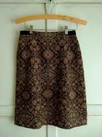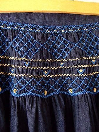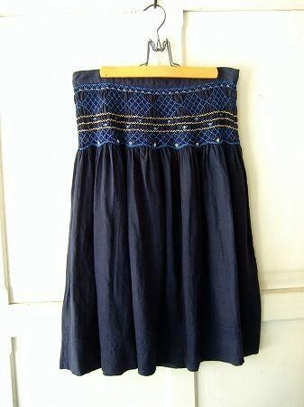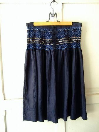 color ネイビー、(刺繍糸 ブルー、オレンジ)、素材 Linen100%、size F、着丈62m、ウエスト68cm、ヒップ120cm、※裏地は付いておりません。前後 どちらを前にしても着用頂けます。