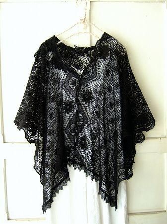 color ブラック、素材 cotton100%、、made in Japan、size F、着丈50cm、バストフリー、長さ112cm、※ボタンと留めると長方形のレースの真ん中に頭を入れる穴が開いているようなデザインです。