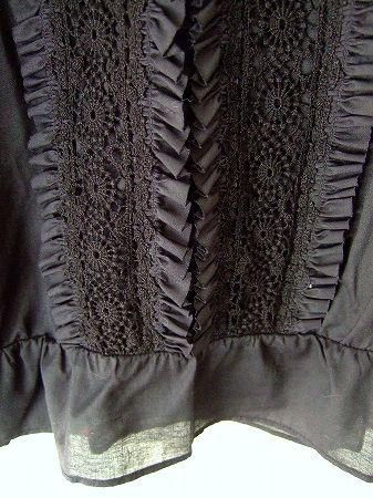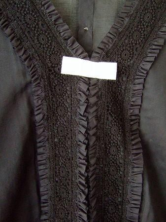 haupiaさんより届きましたブラウスです。繊細なレースのふちはに控えめなフリル。真ん中にちょこんと生成のテープリボンのリボンが付いています。背中ボタンでかわいさをプラス。haupiaさんらしい素敵なブラウスです。color ブラック、素材 cotton100%、(レース部分 cotton100%)、made in China、size 38、着丈53m、バスト92cm、袖丈27cm、肩幅38cm