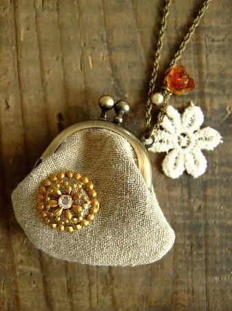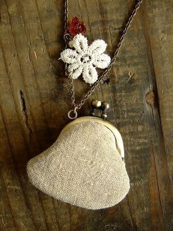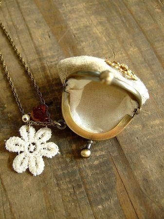 color ナチュラル、アイボリー、レッド、金古美、素材 リネン、コットン、真鍮、size (ガマ口)5.5×5.5cm、(チェーンの長さ65cm、アジャスター5cm)、※ドイツアンティークリネン、ドイツ・ベルギーアンティークモチーフ、フランスアンティークレース、ヴィンテージガラスパーツ、ヴィンテージチャーム使用。ガーゼのミニポーチ付き。