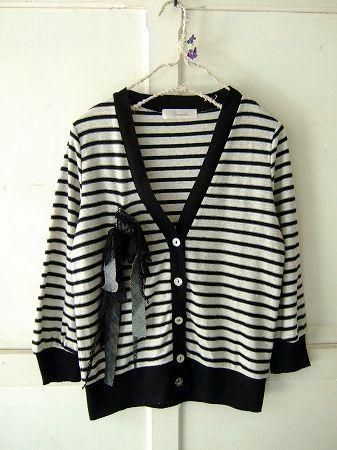 color ブラック×ライトグレー、素材 cotton100%、、(リブ部分 cotton85%、wool15%)、made in Japan、size F、着丈57cm、バスト93cm、袖丈48cm、肩幅38cm、※フロントに4種類のボタンが付いています。ボーダー生地の裏側を使用しており、表情のある素材となっております。コサージュは取り外し可能です。お好みの場所へどうぞ。