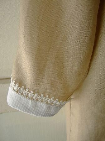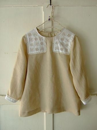 color ベージュ、オフホワイト、(刺繍 ベージュ)、素材 Linen 100%、(別布 cotton52cm、Linen48%/レース部分 cotton100%)、made in China、size 38、着丈58cm、バスト92cm、袖丈43cm、肩幅38cm、※裏地は付いておりません。