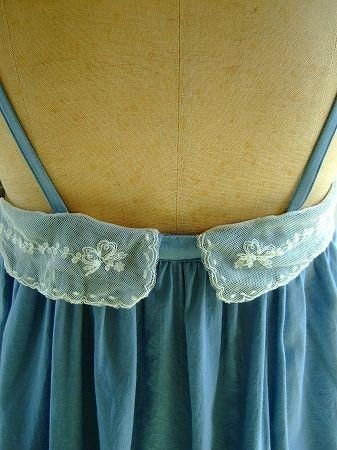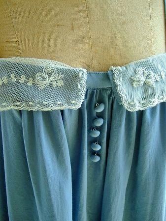 color ブルー、アイボリー、素材 cotton100%、(レース部分)ナイロン100%、made in Japan、size F、着丈82m、バスト88cm、肩幅38cm、※裏地は付いておりません。チュールレース襟部分はスナップボタンで留まっております為、取り外し可能です。