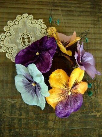 color ブルー、パープル、イエロー、オレンジ、素材 コットン、シルク、made in JAPAN、size (コサージュ部分)直径5cm×5つのパンジー