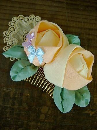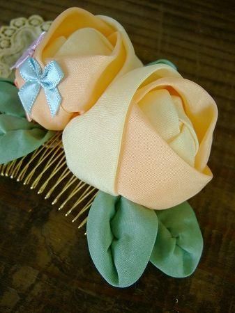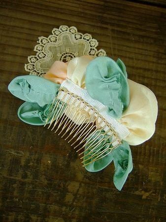 color ピンク、アイボリー、グリーン、ブルー、パープル、素材 コットン、シルク、真鍮、made in China、size (バラ)5×12cm、(コーム幅5cm)、※葉っぱの裏柄の縫い目、縫いしろが見えております。予めご了承下さいませ。