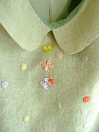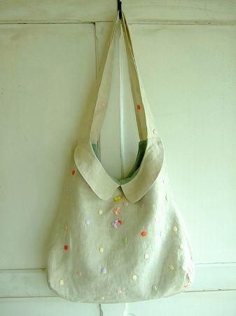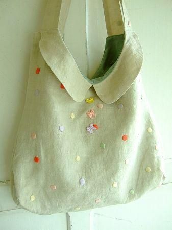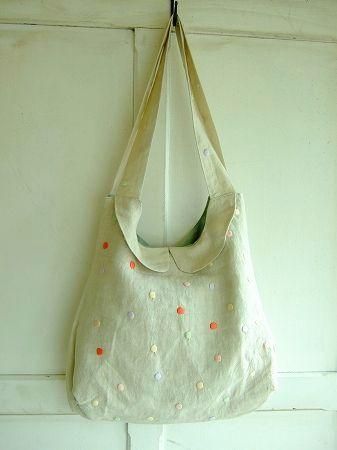 colorナチュラル、(ドット刺繍)ピンク、グリーン、レッド、パープル、イエロー、素材 Linen100%、(裏地)cotton100%、made in China、size 35×41cm、(持ち手)64cm、