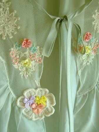 color ミント、オフホワイト、(フラワー)ピンク、ブルー、イエロー、グリーン、素材 シルク100%、(別布 ナイロン100%)、made in China、size F、着丈42cm、バスト フリー、袖丈18cm、肩幅38cm、※裏地は付いておりません。