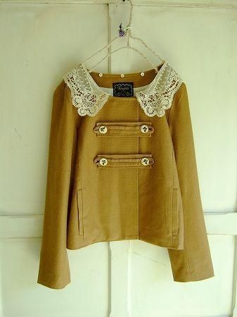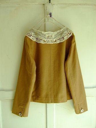 color ダークベージュ(ブラウン)、素材 コットン52%、レーヨン33%、リネン15%、(裏地ポリエステル100%、レース襟 糸/コットン100%、チュール/ナイロン100%)、made in China 、size 38、着丈50cm、バスト94cm、袖丈57cm、肩幅38cm