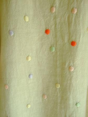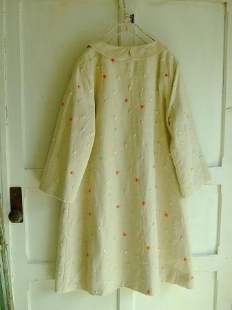 color ナチュラル、(ドット刺繍)ピンク、グリーン、レッド、パープル、イエロー、素材 Linen100%、(裏地 cotton100%)、made in China、size F、着丈89cm、バスト98cm、袖丈48cm、肩幅39cm