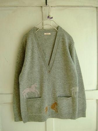 color グレー、ブラウン、オフホワイト、ピンク、素材 ラムウール80%、ナイロン20%、made in China 、size 38、着丈67cm、バスト95cm、袖丈61cm、肩幅38cm、※馬の部分はニードルパンチが施されています。