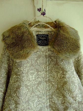 color グレージュ、オフホワイト、シルバー、ナチュラルブラウン、素材 コットン47%、ポリエステル31%、ウール11%、テンセル11%、(別布部分 レーヨン77%、シルク23%、裏地 ポリエステル100%、襟 ラビットファー)、made in China 、size 38、着丈50cm、バスト100cm、袖丈41cm、肩幅38cm、フロントには大きめのスナップボタンが3つ付いています。ファー部分は取り外しが可能です。