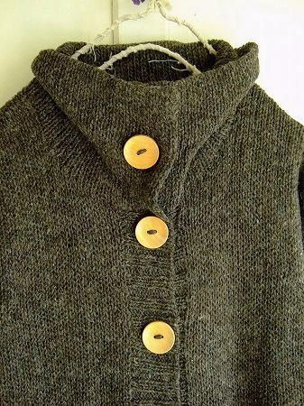 こちらはざっくり編みが 素敵なロングカーディガンです。 コーディネートしやすい、落ち着いたお色です。 おしりも隠れてとってもあったかい ニットカーディガンです。 襟についているボタンを留めるとスタンドカラーに!!