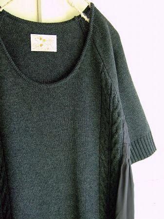 color チャコール、素材 cottonアクリル50%、ナイロン30%、ウール20%、(別布 レーヨン100%)、made in China 、size 38、着丈93cm、バスト95cm、袖丈34cm、肩幅38cm、※サイドがタックを施したサテンの切替しとなっています。