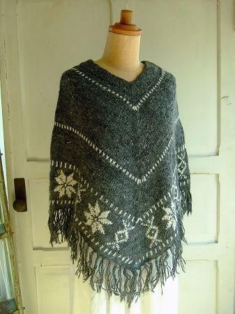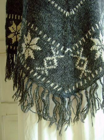 color チャコール、オフホワイト、素材 アルパカ100%、made in PERU 、size F、着丈57cm、裾周り140cm、フリンジ11cm