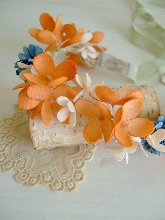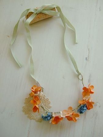 color ブルー、オレンジ、オフホワイト、グリーン、素材 コットン、made in JAPAN、size (フラワーワイヤー部分)21cm、リボン60cm×2本、※ネックレスやへットドレスとして。またバッグに付けたり、ブレスとして腕に付けても素敵です。いろいろなアレンジが楽しめます。