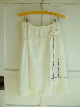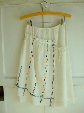 color オフホワイト、(刺繍 ブルー、ピンク、レッド、イエロー、ベージュ、ブラック)、素材 リネン55%、レーヨン45%、(裏地 コットン100%)、made in China、size F、着丈66cm、ウエスト70cm、ヒップ110cm