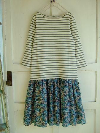 color (ボーダー)アイボリー×グレー、(スカート部分)ブルー、ベージュ、パープル、グリーン、オフホワイト、素材 cotton100%、(スカート部分 cotton100%、裏地 ポリエステル100%)、size 38、着丈96m、バスト82cm、袖丈46cm、肩幅38cm、※裏地はスカート部分のみとなります。