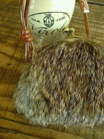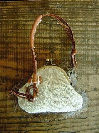 color ナチュラルブラウン、ナチュラルグレー、アイボリー、ブラウン、素材 ラビットファー、コットン、リネン、レザー、真鍮、made in Japan、size 8.5×10cm、(革ひもの長さ)30cm、※ドイツアンティークリネン、リバティプリントコットン使用。