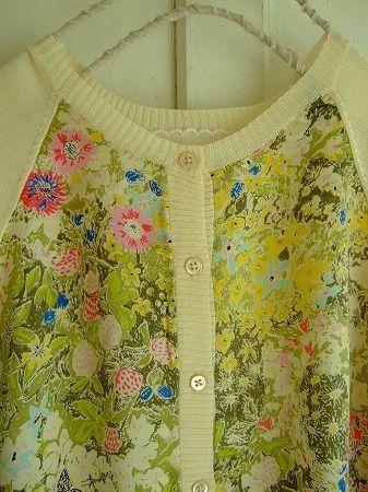 color アイボリー、グリーン、ピンク、ブルー、イエロー、ブラック、素材 (ニット部分)コットン46%、レーヨン(ビスコース)46%、(布帛部分)シルク100%、made in China、size 38、着丈48cm、バスト94cm、袖丈32cm、肩幅38cm、※裏地は付いておりません。