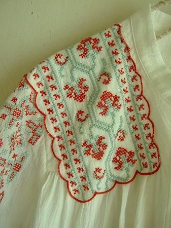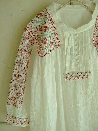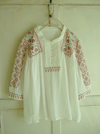 color オフホワイト、(刺繍 レッド、ブルー)、素材 cotton100%、made in China、size F、着丈59cm、バスト122cm、袖丈37cm、肩幅38cm