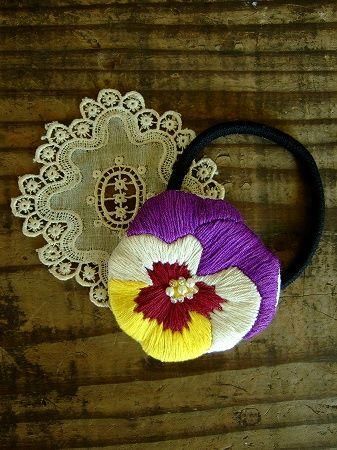 color パープル、イエロー、ベージュ、素材 コットン、ピーズ、made in China、size モチーフ 直径5.5cm