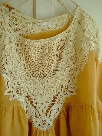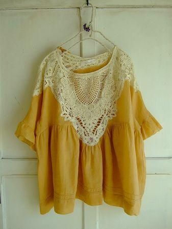 color オレンジ、アイボリー、素材 Linen100%、(レース cotton100%)、made in Japan、size F、着丈60cm、バスト110cm、袖丈33cm、肩幅38cm、※レース部分に裏地は付いておりません。透かしになっております為、インナーを着用下さい。背中部分は合わせになっておりスナップボタン、リボンで留まっています。