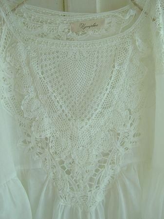 color オフホワイト、素材 Linen100%、(レース cotton100%)、made in Japan、size F、着丈60cm、バスト110cm、袖丈33cm、肩幅38cm、※レース部分に裏地は付いておりません。透かしになっております為、インナーを着用下さい。背中部分は合わせになっておりスナップボタン、リボンで留まっています。