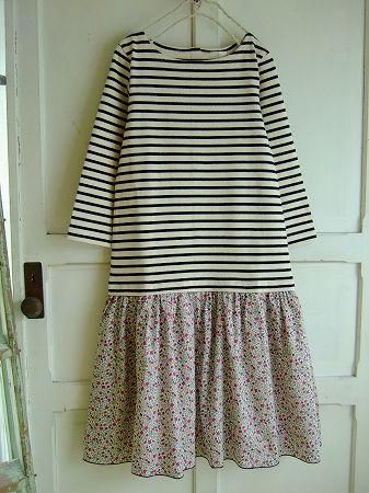color (ボーダー)アイボリー×ブラック、(スカート部分)オフホワイト、パープル、グリーン、素材 cotton100%、(スカート部分 cotton100%、裏地 ポリエステル100%)、size 38、着丈97m、バスト82cm、袖丈45cm、肩幅38cm、※裏地はスカート部分のみとなります。