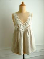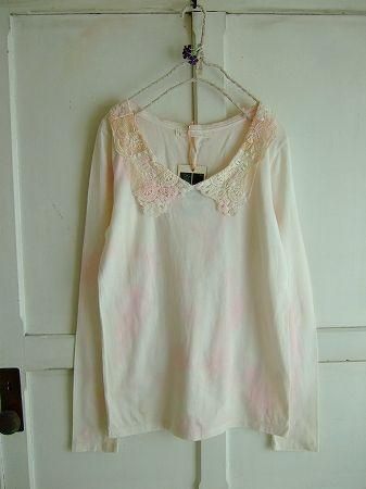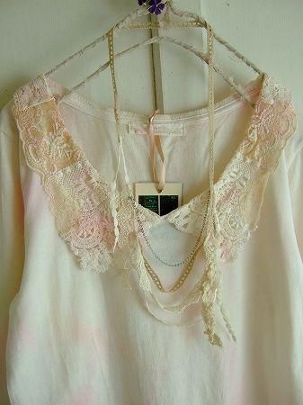 color むら染めピンク、素材 cotton100%、made in Japan、size F、着丈60cm、バスト83cm、袖丈64cm、肩幅39cm、※レースのネックレス付です。こちらの製品はデッドストックやアンティークのパーツを使用したリメイク品です。アンティークな風合いを出す為に手染め加工しております。直射日光・蛍光灯などの長時間の照射により色褪せたり、濃色品の場合摩擦により淡色に色移りする事があります。色褪せ、縮みなどを最小限にされます場合はドライクリーニングがお勧めです。