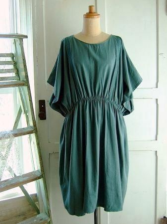 color グリーン、素材 cotton90%、wool10%、made in Japan、size 38、 着丈97m、バスト フリー、袖丈27cm、肩幅38cm、※裏地は付いておりません。ウエスト部分にゴムが入っております。