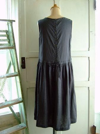 color チャコール、素材 Linen100%、made in Japan、size 38、着丈107cm、バスト95cm、肩幅38cm、※裏地は付いておりません。ウエストにリボンが通っておりますので、絞ってギャザーの調節が可能です。