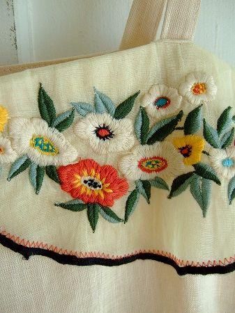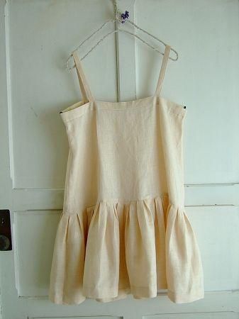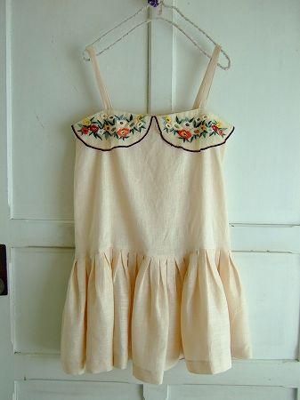 color ベージュ、素材 Linen100%、(刺繍襟 cotton100%)、made in China、size F、着丈77cm(肩ひも含みます)、バスト86cm、肩幅38cm、※刺繍襟はスナップボタンで留まっております為、取り外し可能です。裏地は付いておりません。