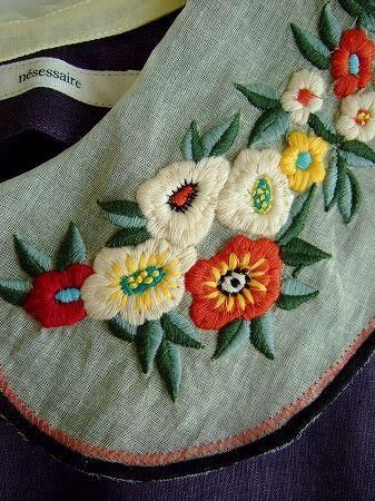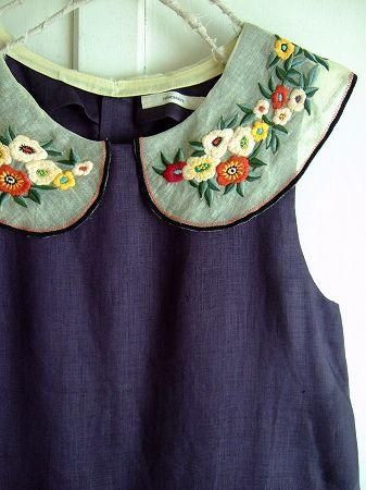 color ネイビー、素材 Linen100%、(刺繍襟 cotton100%)、made in China、size F、着丈88cm、バスト88cm、肩幅38cm、※刺繍襟はスナップボタンで留まっております為、取り外し可能です。裏地は付いておりません。