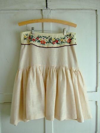 color ベージュ、素材 Linen100%、(刺繍ベルト cotton100%)、made in China、size F、着丈60cm、ウエスト78cm、ヒップ105cm、※刺繍ベルトはウエストサイドボタンで留まっております為、取り外し可能です。裏地付き。