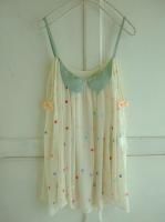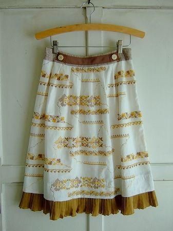 color オフホワイト、イエローベージュ、ブラウン、(刺繍 イエロー、ベージュ)、素材 コットン100%、(別布 リネン100%、プリーツ部分 ポリエステル78%、コットン22%、ペチコート キュプラ100%)、made in Japan、size F、着丈62cm、ウエスト68cm、ヒップ120cm