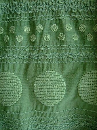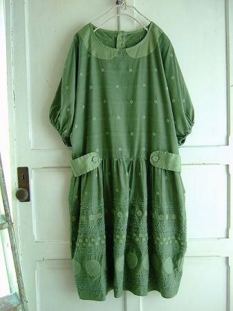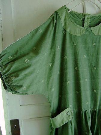 color グリーン、素材 コットン50%、キュプラ50%、(別布 コットン100%)、made in Japan、size F、着丈97cm、バスト105cm、袖丈32cm、肩幅38cm、※裏地は付いておりません。袖口・背中ウエスト部分にゴムが入っています。