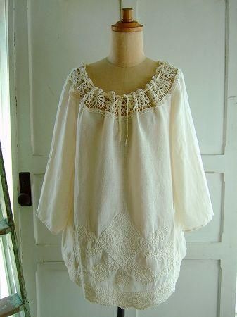 color アイボリー、素材 cotton100%、(レース部分 cotton100%)、made in India、size 38、着丈60cm(フロント70cm)、バスト115cm、袖丈48cm、肩幅38cm、※裏地は付いておりません。首周りのリボンを絞ると胸元の開き具合の調節が出来ます。お好みでどうぞ。