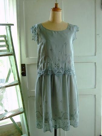 color ブルーグレー、素材 cotton100%、(レース部分cotton100%、アンダードレス ポリエステル100%)、made in China、size 38、着丈91cm、バスト90cm、肩幅38cm、※取り外し可能なベージュのアンダードレス付き。