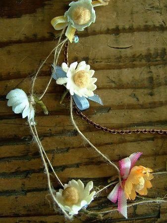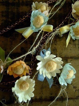 color オフホワイト、オレンジ、ブルー、ピンク、銅古美、素材 コットン、真鍮、made in JAPAN、size (ひなぎく1輪)直径1.2cm、チェーンの長さ45cm