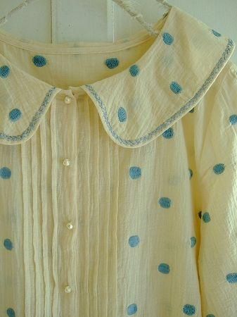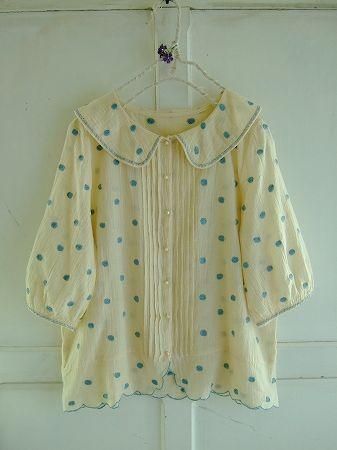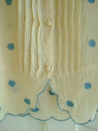 color アイボリー、ブルー、素材 cotton100%、made in China、size F、 着丈54cm、バスト100cm、袖丈35cm、肩幅38cm、※裏地は付いておりません。