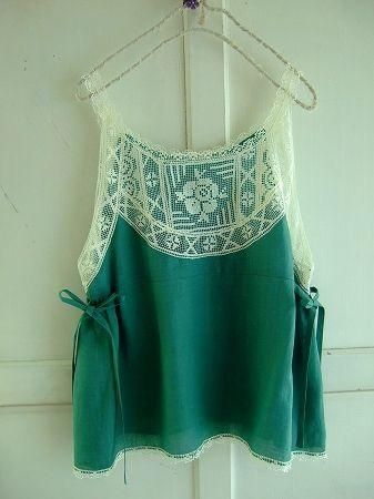 color グリーン、(レース)アイボリー、素材 Linen100%、made in China、size F、 着丈58cm(肩ひも含みます)、バスト88cm、肩幅38cm、※裏地は付いておりません。胸元はレースのみとなります為、インナーにキャミソールやカットソーなどを着用下さい。