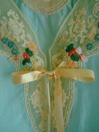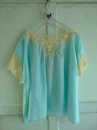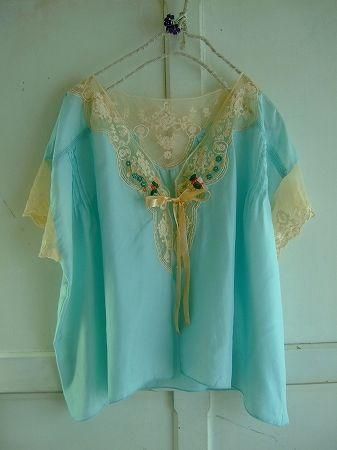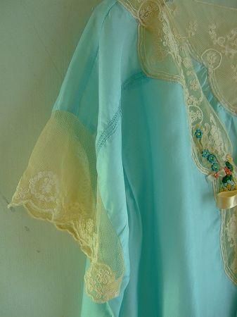 color ブルー、アイボリー、(刺繍 ピンク、ブルー、レッド、グリーン)、素材 シルク100%、(別布 ナイロン100%)、made in China、size F、着丈50cm、バスト フリー、袖丈18cm、肩幅38cm