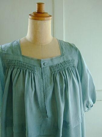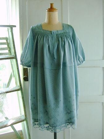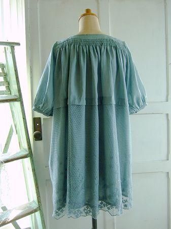 color ブルーグレー、素材 Linen100%、(別布 cotton100%)、made in China、size F、 着丈82cm、バスト136cm、袖丈33cm、肩幅38cm、※レース部分のみ同色コットンの裏地付きです。