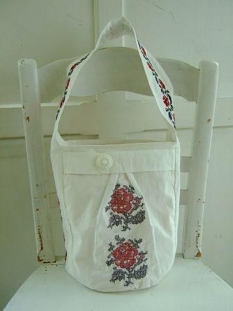 color オフホワイト、(刺繍)レッド、ダークグリーン、素材 cotton100%、made in China、size (底) 直径19cm、(高さ)24.5cm、(持ち手)54cm