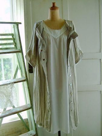 color エクリュ、素材 Linen100%、(別布 cotton100%)、made in Japan、size 38、着丈98cm、バスト90cm、袖丈32cm、肩幅38cm、※裏地は付いておりません。フロントには隠しボタンが付いておりまして前開きにして羽織って頂けます。