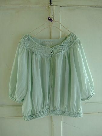 color ブルーグリーン、素材 cotton100%、made in China、size 38、着丈48cm、バスト115cm、袖丈34cm、肩幅38cm