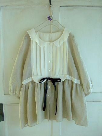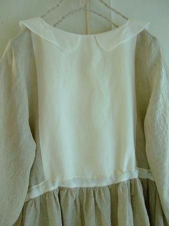 color ナチュラル、オフホワイト、素材 Linen45%、Silk45%、(別地)Linen100%、(襟部分)cotton100%、made in Japan、size F、 着丈64cm、バスト98cm、袖丈41cm、肩幅38cm、※ウエストのリボンをギュッと絞ってギャザーの調節が可能です。お好みでどうぞ・・・。