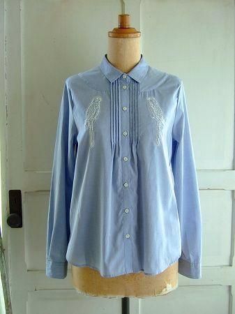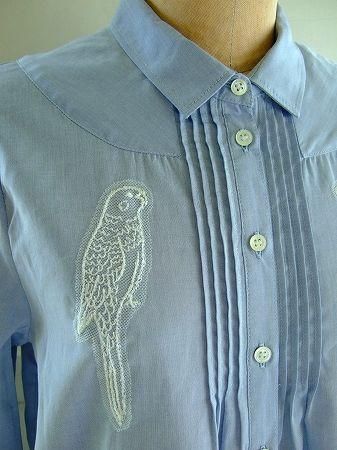 color ブルー、(レース)オフホワイト、素材 cotton100%、(刺繍部分)レーヨン100%、made in China、size 38、着丈57cm、バスト94cm、袖丈58cm、肩幅38cm