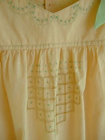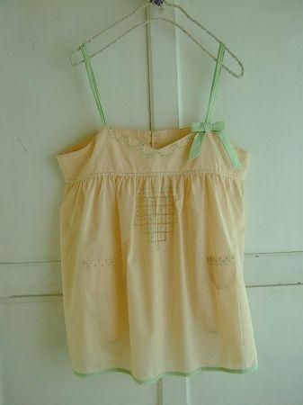 color ピンクベージュ、グリーン、素材 cotton100%、made in China、size F、 着丈63cm(肩ひも含みます)、バスト89cm、肩幅38cm、※裏地は付いておりません。リボンはブローチになっておりますのでお好みの場所へどうぞ・・・。